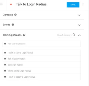 In the Intent section, enter your training phrases. Start with “talk to”, “speak to”, “ask” and etc, learn more