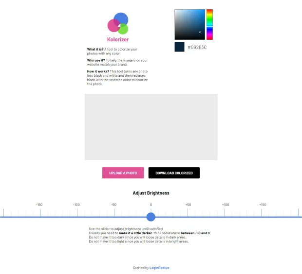 After you upload the image, it is converted to your selected brand color right away. Adjust the color if you need to. Maybe try a different dark color out of your brand colors. Then adjust the brightness of the image if needed and download the finished colorized image. That is it!