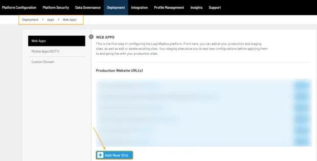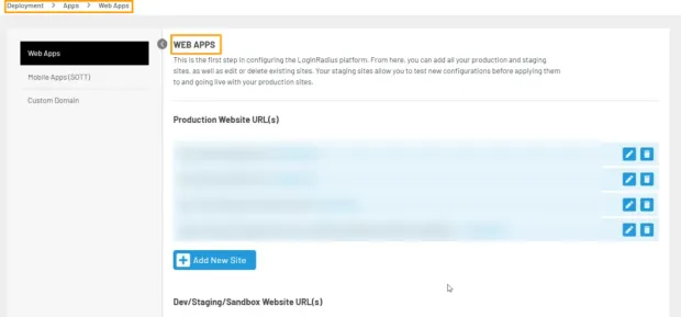 Step 2: Under the Production Website URL, add the domains you want to implement your Web SSO. There is an Add New Site button at the bottom. Click on it to add the domains.
