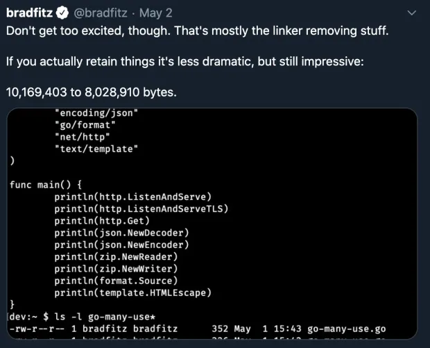 Always new Go 1.15 brings many minor/major performance improvements. The first major improvement has reduced the executable's binary size by almost 5% - 10% as compared to Go 1.14. As Brad Fitzpatrick tweet, test program down from 8.2MB in Go 1.14 to 3.9MB in 1.15.