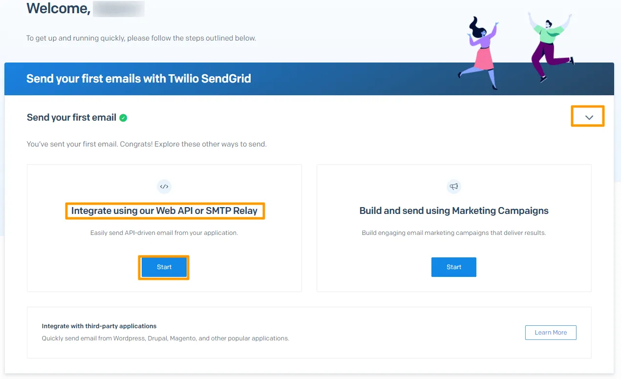 Within the SendGrid Admin-console, click on your account's dropdown menu in the top-left corner and select the Setup Guide. Now expand the Send your first email section and click Start under Integrate using our Web API or SMTP relay. Kindly refer to the following screenshot.